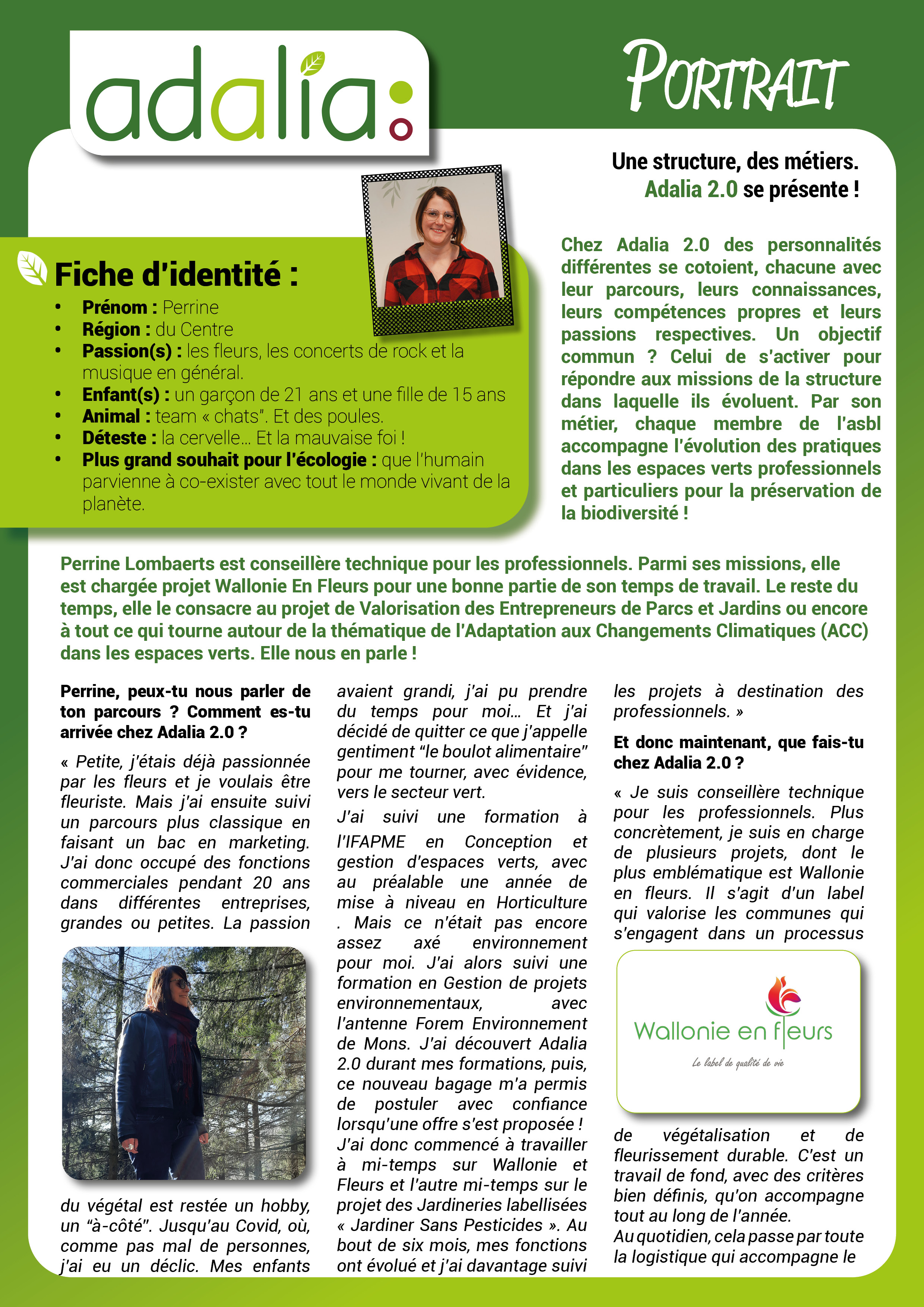 " Je suis conseillère technique pour les professionnels. Plus concrètement, je suis en charge de plusieurs projets, dont le plus emblématique est Wallonie en fleurs. Il s’agit d’un label qui valorise les communes qui s’engagent dans un processus de végétalisation et de fleurissement durable. C’est un travail de fond, avec des critères bien définis, qu’on accompagne tout au long de l’année.